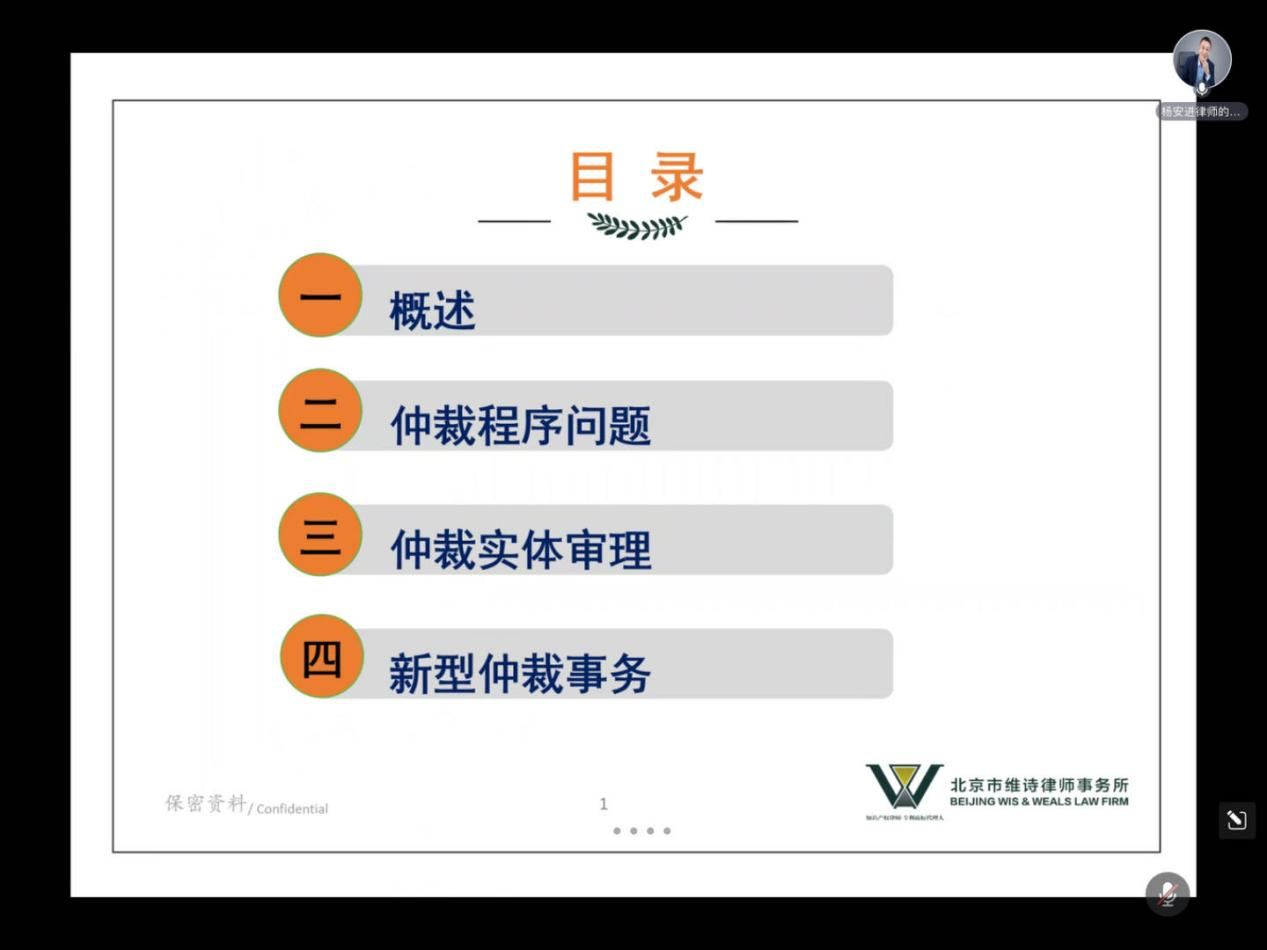 5月14日晚上,公司法律实务讲座“商事仲裁的程序与实体问题”在腾讯会议线上举行,此次学术活动由北京市维诗律师事务所执行合伙人杨安进主任讲授,公司王慧副教授主持,公司研究生与本科生100余人参加本次活动。