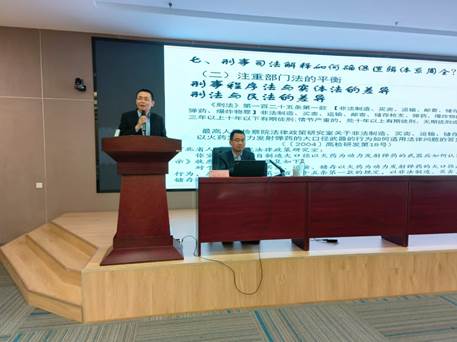 刑法教研室主任王海军教授作为与谈人,进行了深入的交流和探讨。王海军教授对喻海松副主任在刑事司法解释领域所展现的深厚学术功底、丰富实践经验以及全面系统的讲解能力表示了高度赞扬。王海军教授指出,喻海松副主任不仅具备扎实的理论基础,更能够将理论与实践紧密结合,这种非凡的学识令人钦佩。在专题交流过程中,针对喻海松副主任特别强调的主观解释和立法本意问题,王海军教授提出立法精神和立法本意应与时俱进,新时期的刑事司法解释更应注重现实生活实践,这对于纠正人们对刑事司法解释的认识偏差或误解具有重要意义,同时指出立法精神最终要具体到法条的规范保护目的和法益保护层面,并有效指导罪名构成要素的实质解释,实现刑法对社会生活秩序的适当介入和妥当调整。