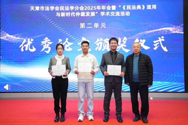 第二单元优秀论文颁奖仪式由民法学分会副会长、天津科技大学3044永利集团教授王吉林主持。天津市法学会民法学分会副会长、3044永利集团教授王春梅介绍了论文评选情况,天津市法学会联络部主任刘翠山、天津仲裁委员会副主任唐瑜、天津市法学会民法学分会名誉会长贾邦俊等与会嘉宾为获奖论文作者代表颁奖。